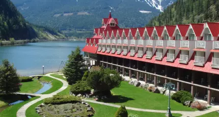 The Three Valley Lake Chateau is a large and dramatic castle-style hotel with a stunning location between the shimmering Three Valley Lake and the rugged Monashee Mountains. Guest rooms have a traditional lodge feel, ranging from standard to spacious loft rooms and quirky themed suites such as the amazing Cave suite complete with rocky walls and gold four-poster bed, and all boast balconies with views over the gardens and lake. The resort also has a heated indoor pool, jacuzzi, guest laundry, and a cafeteria offering a range of tasty light meals, the friendly Monashee Dining Room offers a full menu and fabulous views.